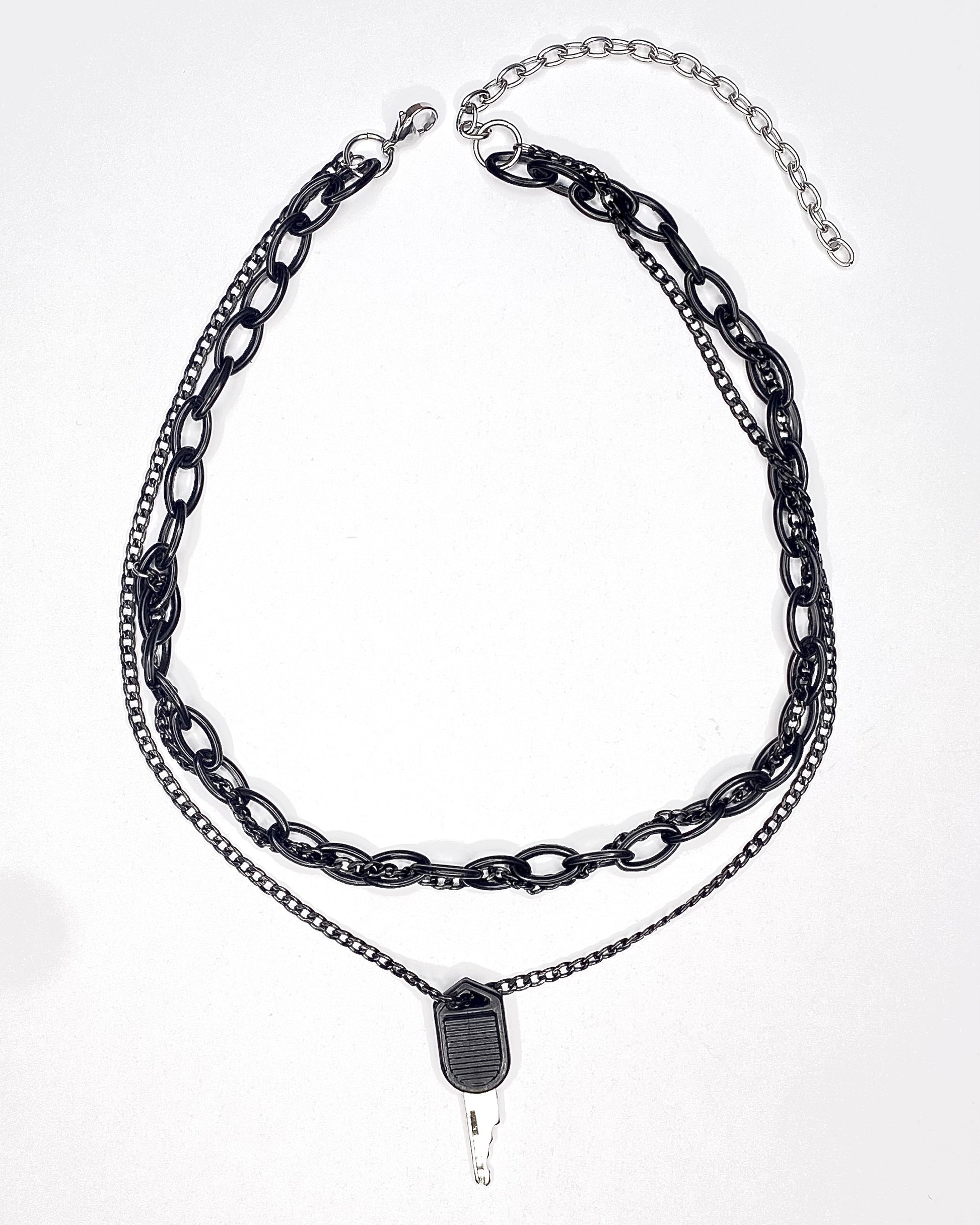 Collar hecho con cadenas negras de acero inoxidable y cadenas de plástico. Con un largo de 40 cm más 10 cm de extensor para alargar la medida del collar.
