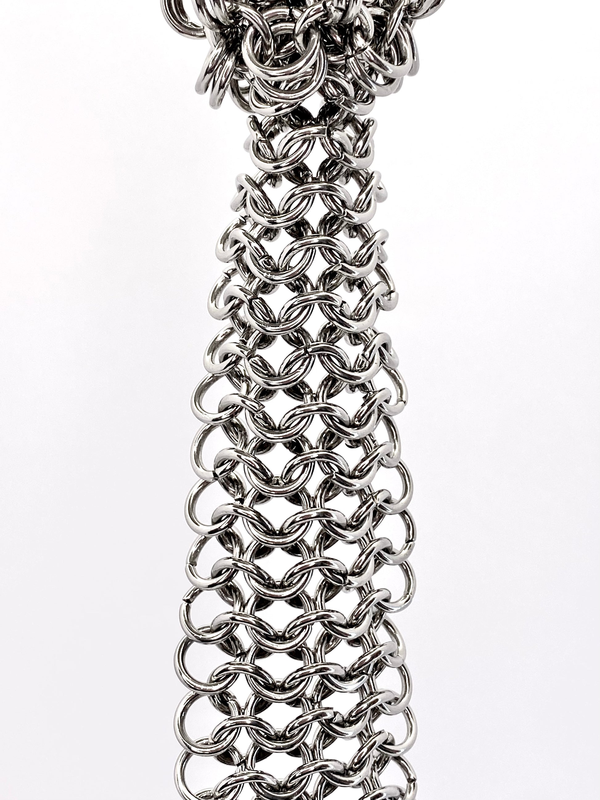 Corbata de argollas de acero inoxidable hecho a mano, esta corbata pesa 2 kilos y viene con un cierre ajustable a todo tipo de cuello.