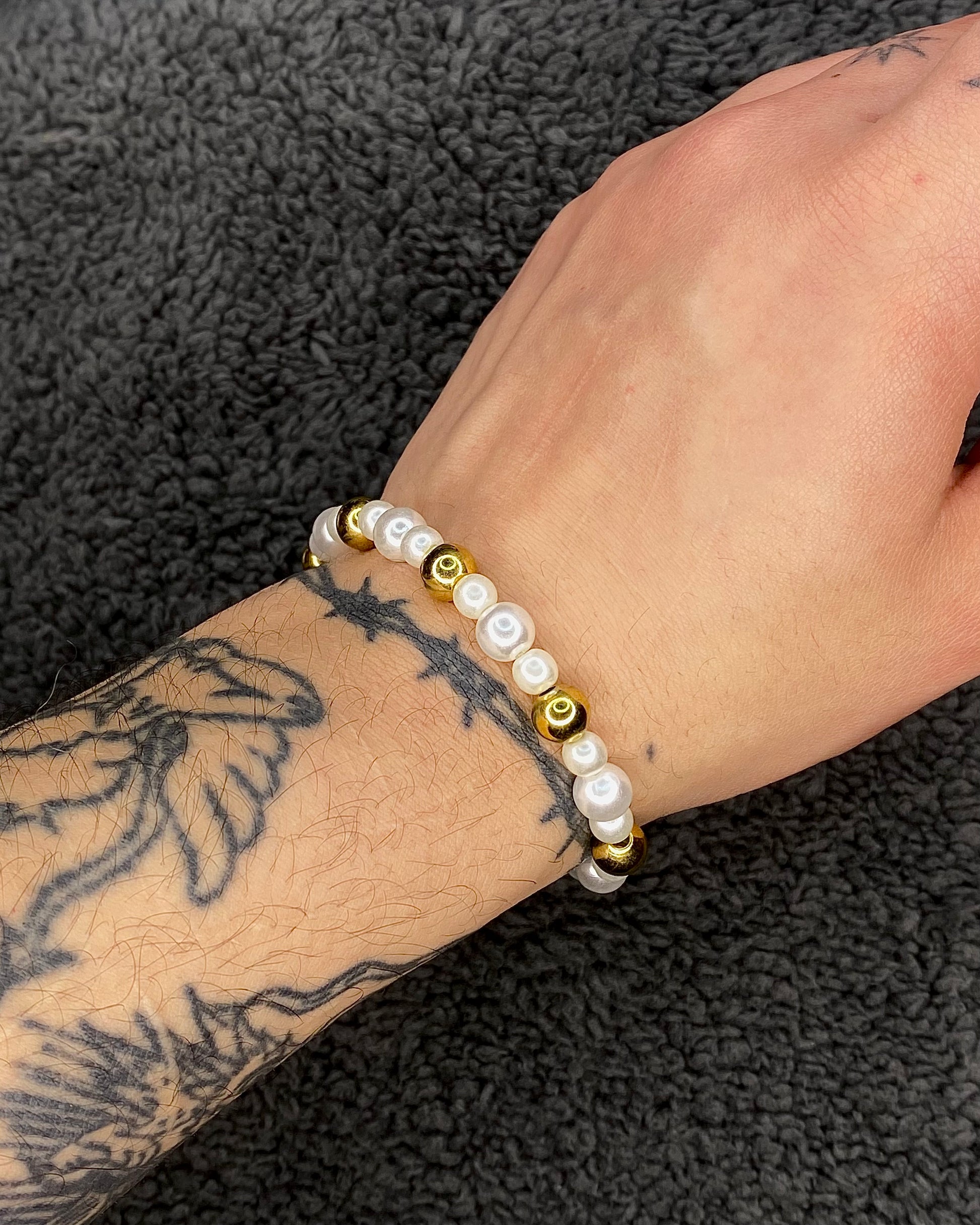 Pulsera con perlas blancas y perlas de acero inoxidable doradas, este modelo mide 19 y da hasta los 20 cm.
